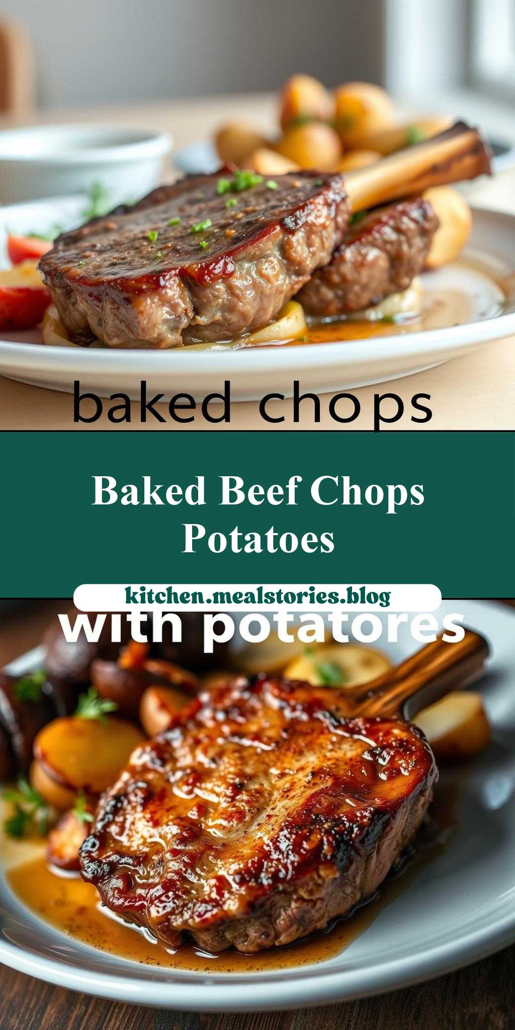 baked beef chops with potatoes in the background and text overlay that reads baked beef chops with potatoes