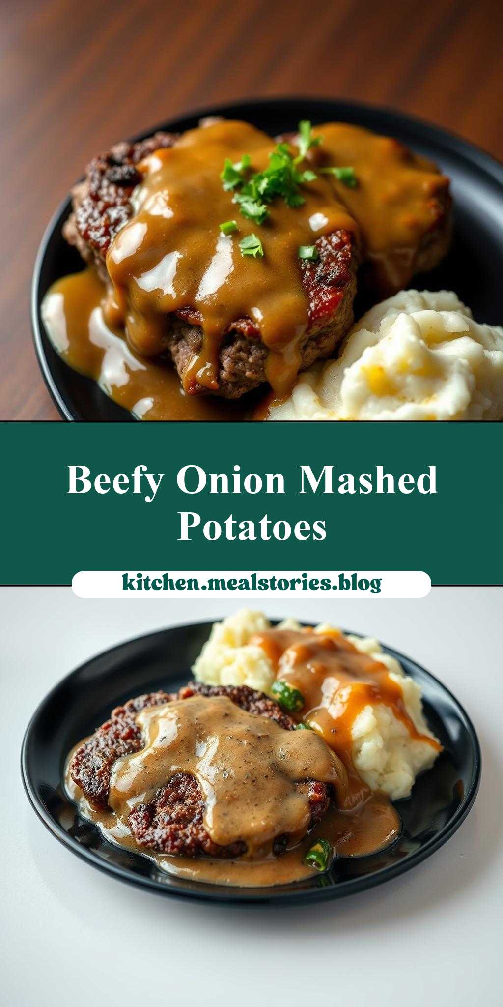 - Step 4: While the gravy is cooking, boil the diced potatoes in salted water until they are tender. Drain the potatoes and mash them with butter, milk, and any desired seasonings until they are smooth and creamy. To plate, place a hamburger steak on each black plate, spoon mashed potatoes alongside, and drizzle the onion gravy over the top.