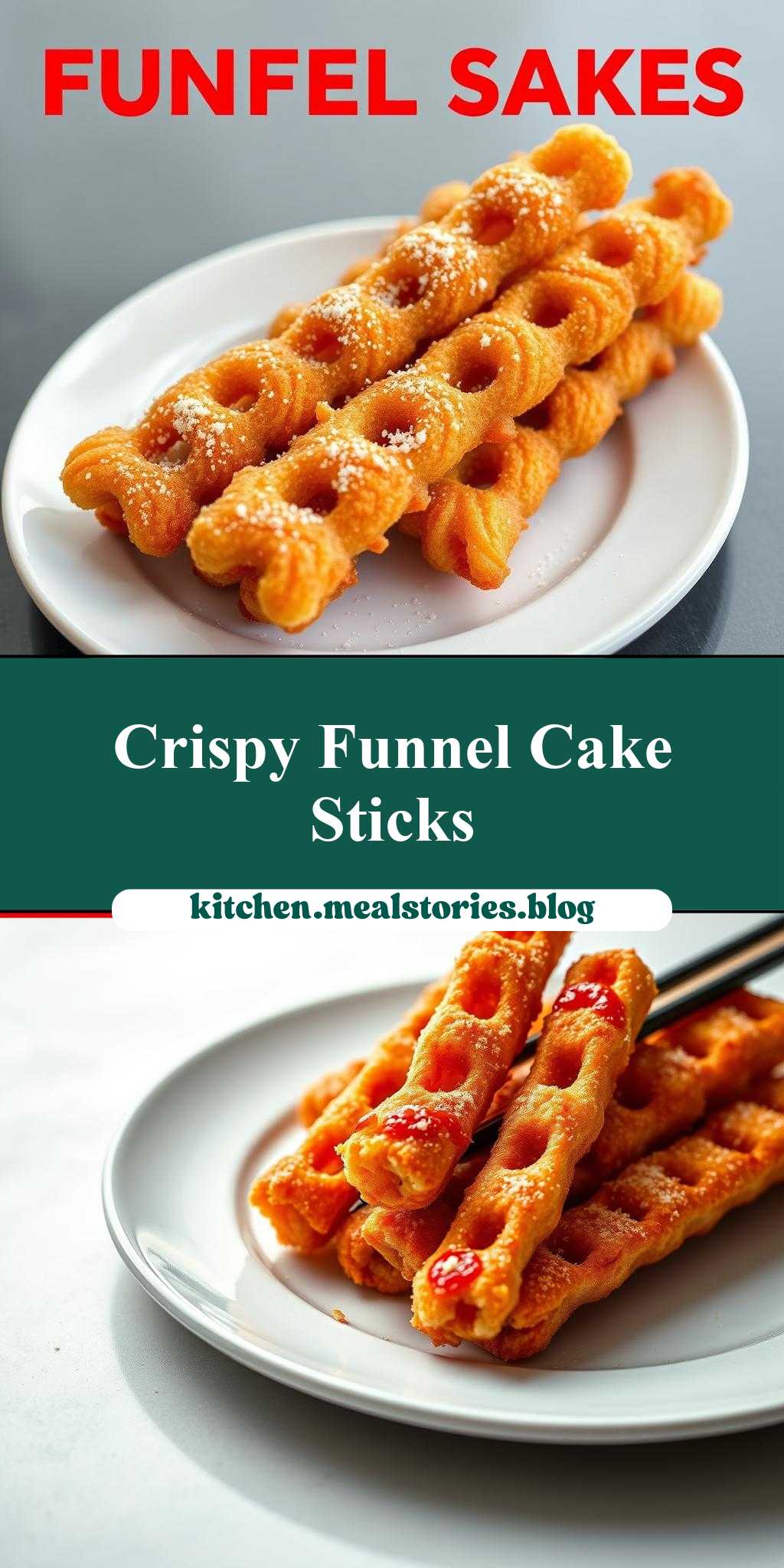 crispy funnel cake sticks on a plate with the title above it in red and white
