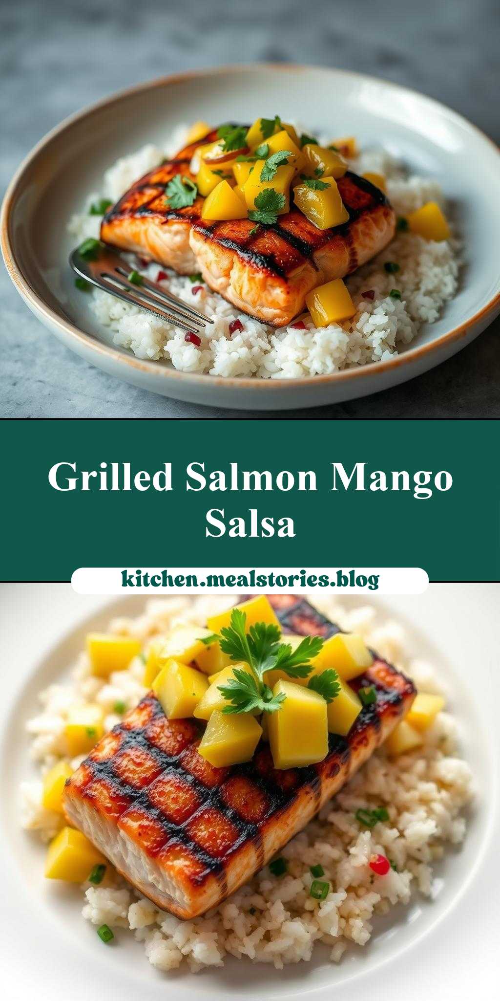 4. Step 4: Final touches and plating. To serve, place a portion of coconut rice on a plate, top with a grilled salmon fillet, and spoon the mango salsa over the salmon. Garnish with additional cilantro if desired, and serve immediately.