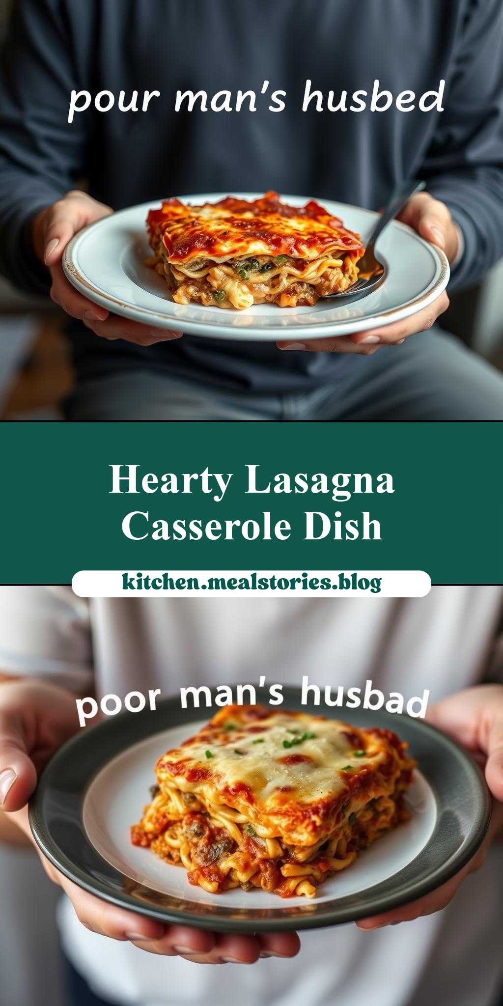 a person holding a plate with lasagna casserole on it, and the text poor man’s husband casserole