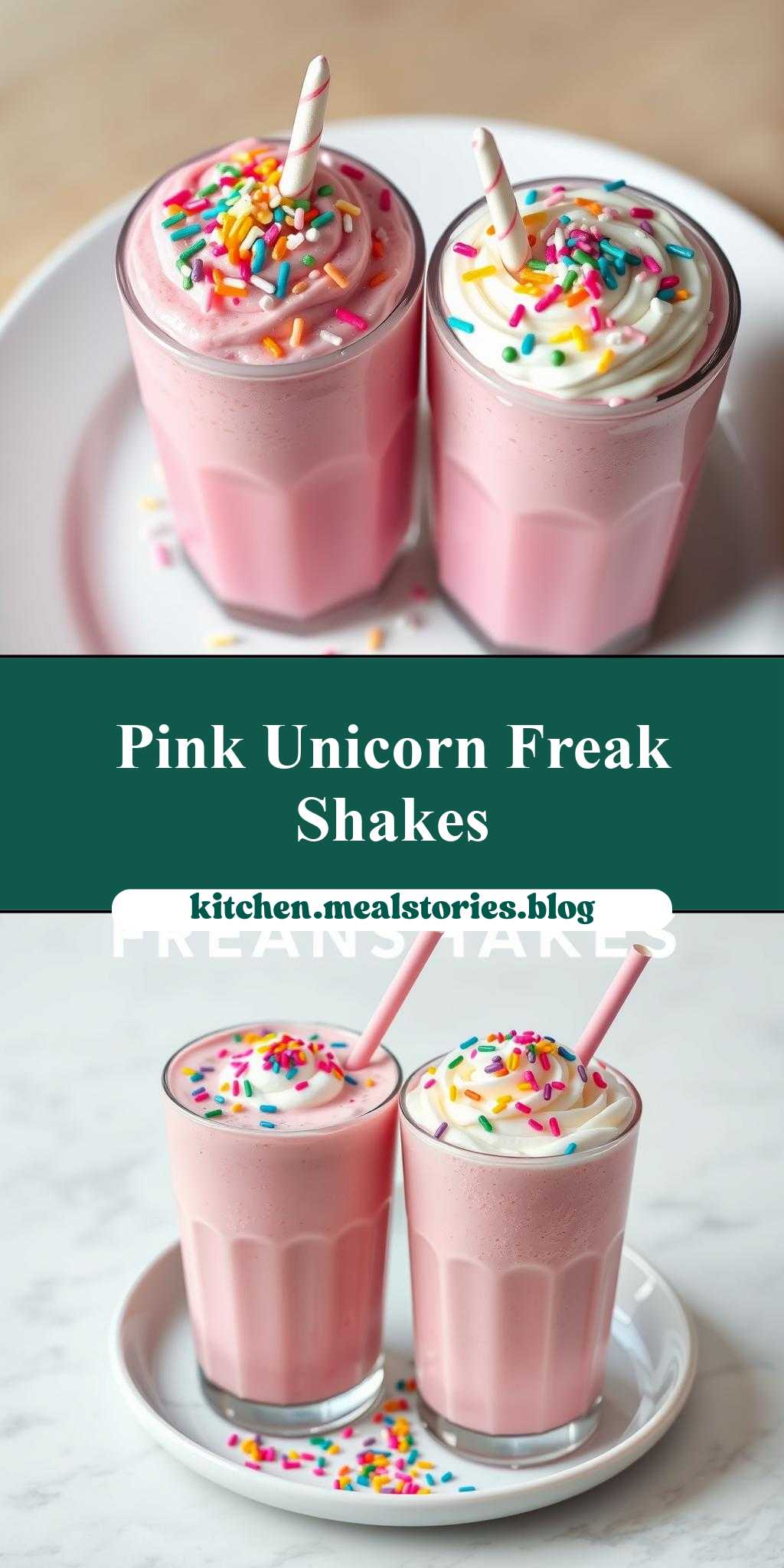 two pink unicorn milkshakes with sprinkles on top, and the words pink unicorn freakshakes above them