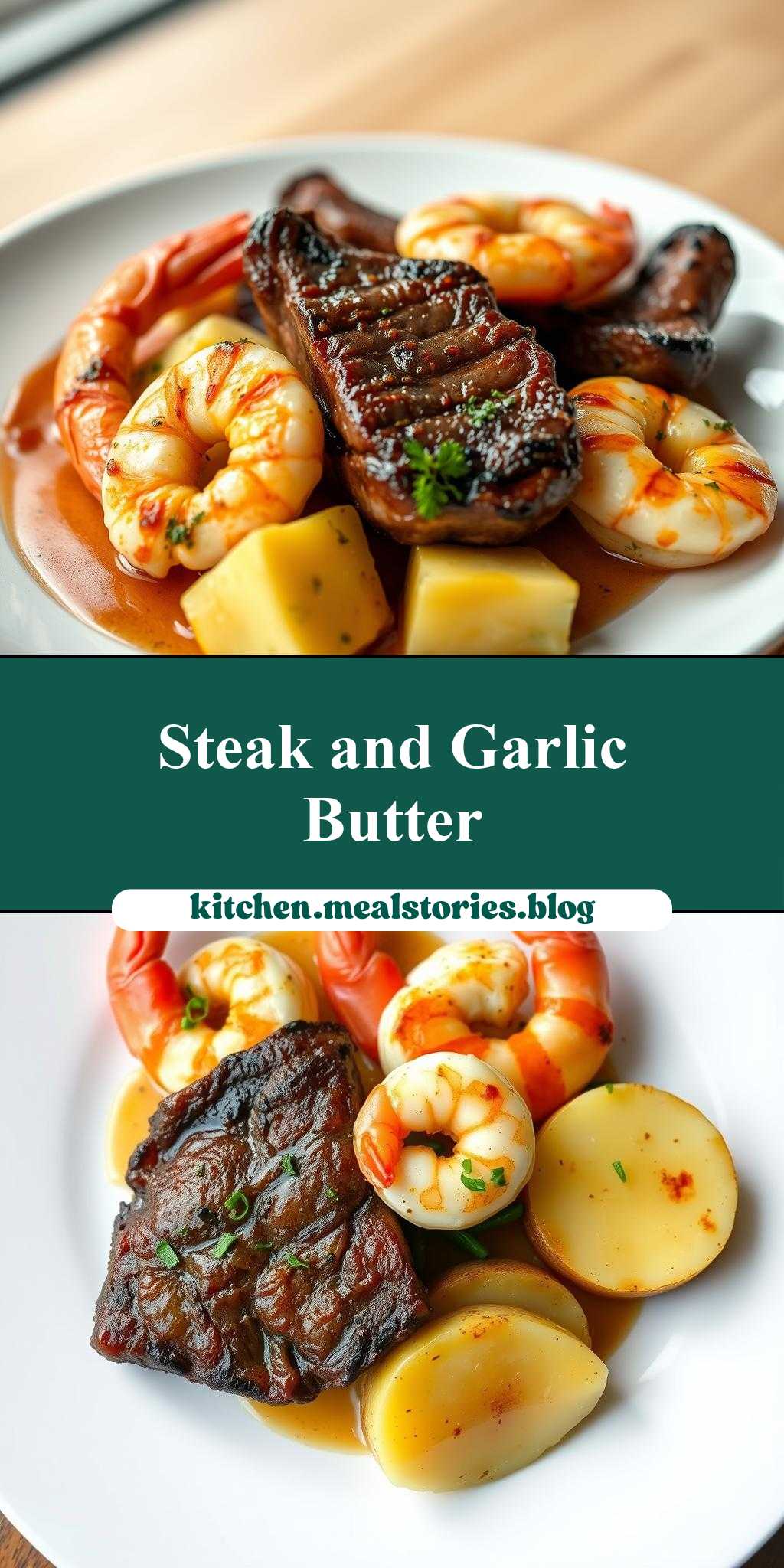The main ingredients in this recipe include a high-quality steak (such as ribeye or sirloin), fresh shrimp, potatoes (preferably Russet or Yukon Gold for their buttery flavor), garlic, butter, olive oil, salt, pepper, and any desired additional seasonings (like paprika or thyme). For practical substitutions, chicken or pork can be used in place of steak for a different twist, and lemon juice or zest can add an extra layer of flavor to the garlic butter. Fresh parsley or chives can also be used as a garnish for added freshness and color.