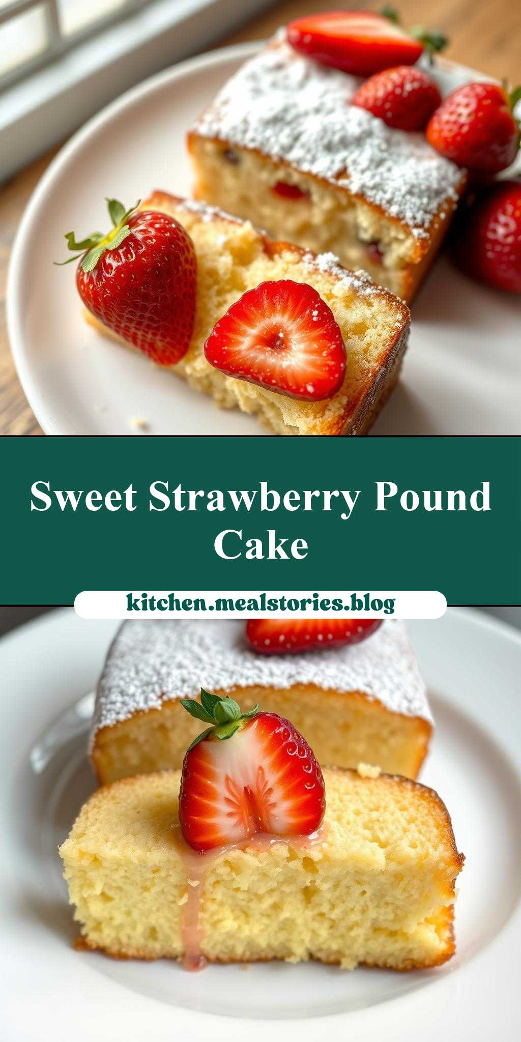 two pictures of pound cake with strawberries and powdered sugar on the top one